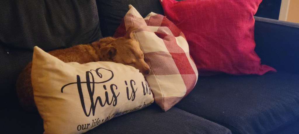 - Claims a charming, slightly neurotic pup who carries teddy bears bigger than he is and who claims dominion over every throw pillow in the house.